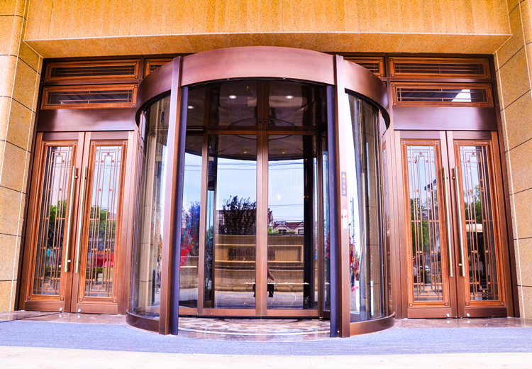 传统的三翼旋转门和四翼旋转门没有展示箱结构,中心门轴通过轴承机构垂直安装在地面上。三四扇门翼发散固定在中心门轴上,各门之间角度相等。人在内扇之间推门,成为手动旋转门。在中心门轴的上方马达和其他电气控制部件,配备感应装置和安全装置,成为自动旋转门。